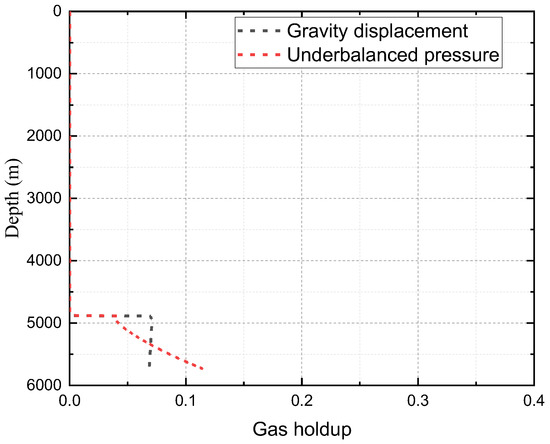 Figure 3 illustrates the distribution of the wellbore annular gas holdup for the gravity displacement gas kick and the underbalanced pressure gas kick, when the total influx reaches 2 m3. At this moment, the top of the gas-liquid mixed-phase section rises to about 900 m from the bottomhole. The gas holdup distribution for the gravity displacement gas kick shows a slight increase in the gas holdup as the well depth decreases, which is due to the constant gas influx rate at the bottomhole, and the volume expansion caused by the decrease in the annulus pressure during the gas kick rises. In contrast, the distribution of the gas holding rate for the underbalanced pressure gas kick is the opposite of the former, showing that the gas holdup in the shallow part of the wellbore is lower than that in its deeper part. It is attributed to the increasing bottomhole gas influx rate for the underbalanced pressure gas kick, and the fact that the volume expansion effect of the gas, as it rises in the annulus, is much smaller than the increase in the bottomhole gas influx rate.