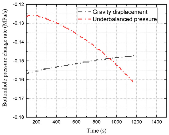 The changes in the bottomhole pressure during the underbalanced pressure gas kick and the gravity displacement gas kick are shown in Figure 4. From the beginning of gas kick to the overflow volume of 2 m3, the bottomhole pressure under both types of gas kicks decreases continuously with time, but the decreasing trend is different. As seen in Figure 5, there is a slightly decreasing trend in the absolute value of the change rate of the bottomhole pressure during the gravity displacement gas kick, while it keeps increasing for the underbalanced pressure gas kick.