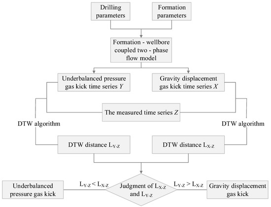 The DTW algorithm uses the dynamic programming principle (DPP) to nonlinearly match the similar features of time series X and Z, Y and Z. The shortest distances, LX-Z and LY-Z, between time series X and Z, Y and Z are obtained, and LX-Z and LY-Z are the similarity scales of time series X and Z, Y and Z. If the similarity scale LY-Z is smaller than LX-Z, it indicates that the matching degree of time series Y and Z is higher than the matching degree of X and Z. That is, the outlet flow curve measured and the outlet flow curve obtained from the underbalanced pressure gas kick simulation, are more similar. Therefore, the gas kick type can be identified as an underbalanced pressure gas kick, otherwise it is a gravity displacement gas kick.