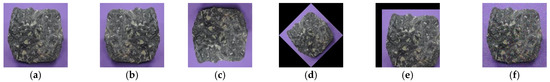 Example of amphibolite image enhancement. (a) Original image; (b) Horizontal Flip; (c) Vertical Flip; (d) Random rotation; (e) Image panning; (f) Gaussian noise wave.
