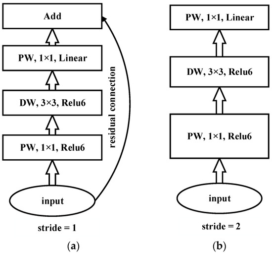 MoboileNetV2 linear bottleneck with inverted residual block structure. (a) Module with stride 1; (b) Module with stride 2.