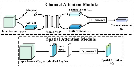 CBAM is a module that incorporates channel attention and spatial attention to increase the feature extraction capability of the network through an attention mechanism [28,29]: focusing on important features and repressing non-essential features, CBAM injects the attention mapping along two separate dimensions of the feature map, channel, and space, and then multiplies the attention by the input feature map to perform adaptive feature refinement on the input feature map. CBAM may be smoothly incorporated into a CNN and so trained end-to-end with the CNN, while the model itself is incredibly lightweight and adds minimal processing. CBAM may be smoothly incorporated into a CNN and so trained end-to-end with the CNN, while the model itself is incredibly lightweight and adds minimal processing. Figure 4 depicts the channel attention and spatial attention structure of CBAM. Assume that given an input feature map , the procedure may be separated into two halves. (1) On each input channel, global maximum pooling and mean pooling are conducted first. The pooled two one-dimensional vectors are fed into the fully connected layer and added by the sigmoid function mapping to obtain the final one-dimensional channel attention called . The channel attention is then multiplied with the input elements again to obtain the channel attention-adjusted feature map F′, and the input feature map is continued to be adjusted and optimized as the spatial attention. (2) Secondly, the two two-dimensional vectors produced by pooling are then stitched together and subjected to convolution operation to obtain the two-dimensional spatial attention known as . Finally, the two-dimensional spatial attention MS is multiplied with F′ by elements, and the optimized output feature value F″ is obtained in accordance with Equation (9).