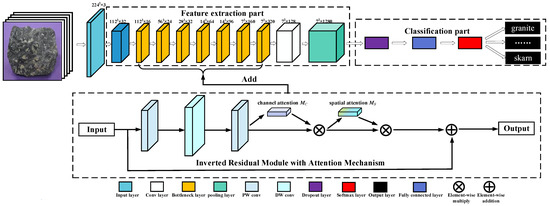 Figure 5 shows the original mobilenetV2 model, and the improved MoboileNetV2 rock recognition model is depicted schematically in Figure 6. The network is primarily composed of two blocks: feature extraction and classification. The feature extraction part consists primarily of two ordinary convolutions, seven depth-separable convolutions with an inverted residual structure of fused attention mechanism, and one pooling. The classification part adopts a fully connected layer + Softmax structure, which is used to classify the network. According to Formula (10), the rocks are categorized, and the category with the highest level of confidence is chosen as the output category for the rocks. The cross-entropy function is then utilized as the loss function, as shown in Formula (11) The particular expression is as follows: to improve the classification results, the less the cross entropy, the closer the network output is to the real value corresponding to the labeling results.