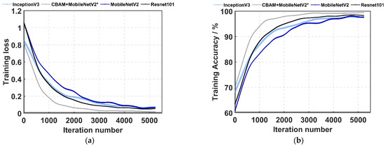 To further validate and explain the efficacy and superiority of the proposed model (CBAM+MobileNetV2), a comparison test was conducted with the representative models in the direction of lithology identification in recent years: the Resnet101 [22] model, the InceptionV3 [21] model, and the MobileNetV2 model without the fused channel spatial attention mechanism, with each model having consistent parameter settings. Figure 7a,b depict the training loss values and training accuracy curves taken from the Matlab training log. The training loss and training accuracy curves of the proposed model converge in approximately 2000 iterations, which is faster than the other three models, and their final training loss values are lower than the other three models at 0.046, and their final training accuracy reaches 98.59%, which is greater than the other three models. The final training accuracy is 98.59 percent greater than the other three models, indicating that the suggested model has a superior recognition impact on the training set photos.