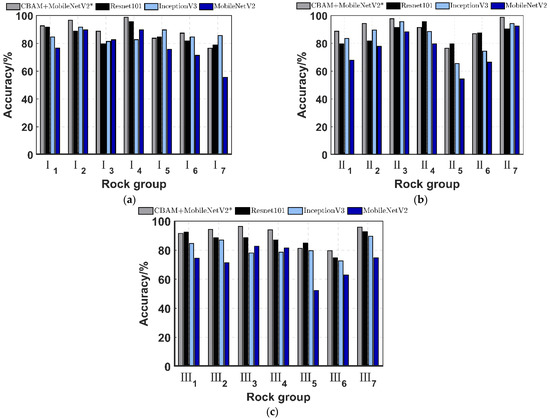 Comparison of correct classification rate of rock images. (a) Comparison of the accuracy of Class I lithology recognition; (b) Comparison of the accuracy of Class II lithology recognition; (c) Comparison of the accuracy of Class III lithology recognition.