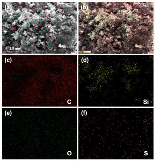 (a) SEM image of Si-graphene; EDS mapping of Si-graphene (b), element C (c), element Si (d), element O (e), and element S (f).