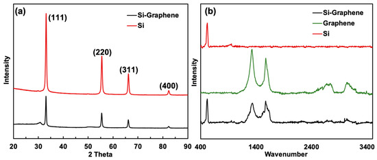Scanning electron microscope (SEM) images were obtained using a Thermo Fisher Scientific (Waltham, MA, USA) HeliosTM 5 DualBeam SEM equipped with an OxfordTM AZtecEnergy advanced system for Energy-dispersive X-ray spectroscopy (EDS). Raman spectroscopy (Foster+Freeman Foram®, Foster+Freeman Ltd., Evesham, WR, United Kingdom) and X-ray diffraction (XRD) (Malvern Panalytical Empyrean X-ray diffractometer equipped with a pixel 3D detector, Malvern Panalytical Ltd., Malvern, WR, United Kingdom) were used to characterize the fabricated Si-graphene composite.
