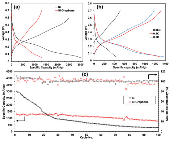 (a) Specific charge/discharge capacity of Si-graphene and Si anodes at 0.05C; (b) specific charge/discharge capacity of Si-graphene anode at 0.05C, 0.1C, and 0.5C, respectively; (c) specific charge/discharge cycling performance of Si-graphene and Si anodes at a current rate of 0.1C in the first 100 cycles.