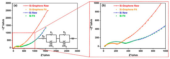 (a) Full-scale and (b) magnified EIS spectra of Li/Si and Li/Si-graphene coin cells.