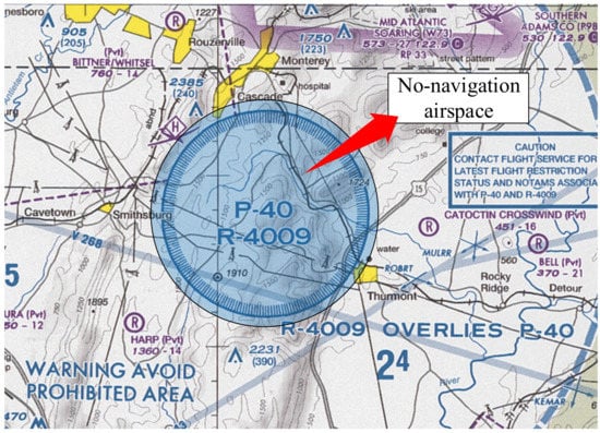 No-navigation airspace refers to the land or territorial sea zones of a country where aircrafts are forbidden to fly (Figure 1); it is usually represented by the letter P on maps. Without special approval in accordance with relevant state regulations, it is forbidden to fly civil aircrafts in no-navigation airspaces, except in the case of a special emergency. No-navigation airspace can be divided into permanent and temporary no-navigation airspace; the former cannot be entered at any time, while the latter appears only during special periods.