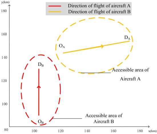 The concept of four-dimensional tracking operations emphasizes the importance of time and places higher demands on the temporal dimension. In addition, due to the changing environment during the flight, the optimal management of the flight plan needs to take into account the pilot’s intentions, the airspace environment, bad weather, and aircraft’s performance. Based on this, the concept of aircraft-accessible area that is proposed in this paper describes the spatial area that can be reached by an aircraft at a given moment during the flight between two waypoints; the specific calculations for this are described in detail in []. Accessible areas can assist with aircraft conflict detection and flight plan safety assessment, they can provide quantitative decision support for air traffic control centers and are of great significance to aviation safety in the context of next-generation air traffic management systems. Figure 5 shows the accessible flight area for aircrafts A and B (OA and OB indicate the start waypoints of the flight paths for the two aircraft, while DA and DB indicate the end waypoints of the flight paths). This area depicts the entire range of space that the aircraft can reach throughout the course of the flight.