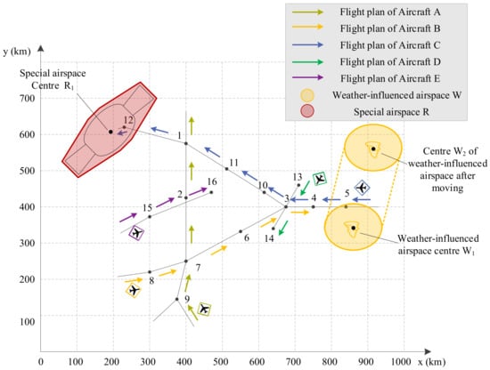 To demonstrate the safety index calculation method proposed in this study, this section abstracts the actual airspace and route structure in eastern China based on a 1000 km × 700 km airspace. The flight plans of five aircrafts in this airspace are extracted based on the actual operational flight information. This airspace contains 16 waypoints (Figure 8), and their location information is listed in Table 1. The weather-influenced airspace W is represented by a circle. The center of airspace W is located at W1 (865, 345), and it will move to W2 (920, 565) from 12:12:24 to 17:52:24. The special airspace is represented by an irregular figure whose center is R1 (195, 605); the impact time lasts from 10:00:00 to 18:00:00 (Table 1).