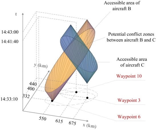Moreover, our results show a risk of conflict between aircraft C on route 3–10 and aircraft B on route 6–3. According to their accessible area and the potential conflict area (Figure 9), there is a risk of conflict between aircrafts B and C from 14:36:50 to 14:40:00. For aircrafts B and C, the potential conflict probabilities are 1.75 × 10−4 and 4.31 × 10−3, respectively, and the safety indices are 7.017543 and 5.948839, respectively. Aircraft C has a higher risk of conflict than aircraft B does.