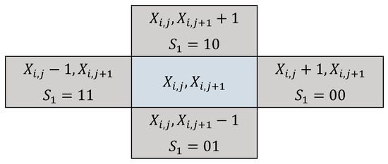 Location based dual image reversible data hiding technique was proposed by Lee et al. [32]. In the method, the cover image pixel pairs are taken as a set of coordinates on the 𝑋 and 𝑌 axes, respectively. This pixel pair accepts the center point of the cross pattern in Figure 1 as consecutive pixels (). The pixel pairs on the four sides (top, bottom, left, and right) of the center pixel pair represent different combinations of secret data of two bits each (S1 or S2).