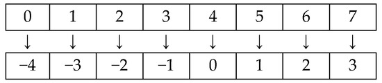 During data hiding process, the change range is also divided into two, as the master record series is divided into two. Therefore, the range of change from to . By rounding down the obtained stego pixel values, the change intervals are obtained as . To avoid FOBP, the data hiding process is performed only for pixels in the range of . Figure 4 shows how the change difference ranges with the changes made in the secret data for n = 4.