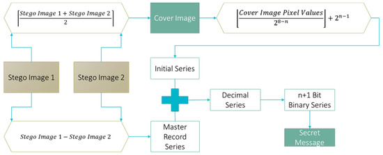 After the original cover image has been recovered, the initial series can be obtained using Equation (7). The extraction of the master record series is accomplished by subtracting the first stego image from the second stego image as shown in Equation (14).