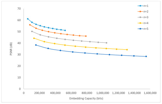 Figure 7 indicates average embedding capacity and PSNR values for n = 1 to 5 in all grayscale images used in experimental studies. In the proposed algorithm, it is seen from the graph that the highest PSNR values are obtained for n = 1 and the maximum payload value is acquired for n = 5.