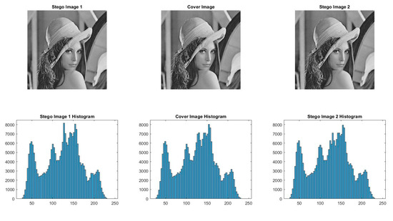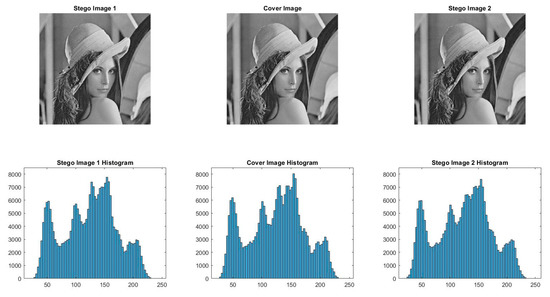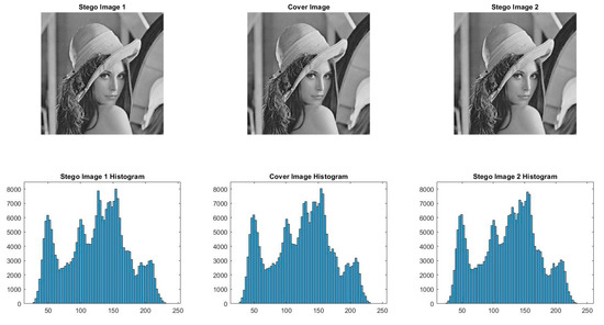 In addition, we applied three steganalysis tests, namely histogram analysis, pixel difference histogram (PDH) and RS analysis, to prove the security of our proposed data hiding algorithm. First, the histogram analysis was performed, showing the pixel value distributions of cover, stego1 and stego2 images according to n = 1 and 3. Figure 8, Figure 9 and Figure 10 present histogram analyzes for n = 1 to 3 in a grayscale Lena image. In addition, the comb effect, which indicates that there is secret data in the stego images, was not observed.