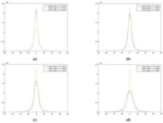 The second method used in security tests is to obtain the distribution of pixel differences as called PDH. In the PDH diagram, the cover image is expected to be according to the zero mean normal distribution. In the stego image PDH, using some data hiding methods, it is possible that the distribution curve is zigzagging, periodically flats (e.g., PVD), multiple peaks (e.g., Histogram Shifting) or deviation from normal distribution. In addition, the similarity of the distributions of two stego images to each other can be a criterion in dual image based reversible data hiding methods. For the proposed data hiding method, PDHs are presented in Figure 11 for n = 1–4 values. It can be seen from Figure 11 that, for all n values, the PDH graphics of two stego images overlap with each other. It is also seen that cover and stego images PDH analyzes for n = 1 to 3 are close.