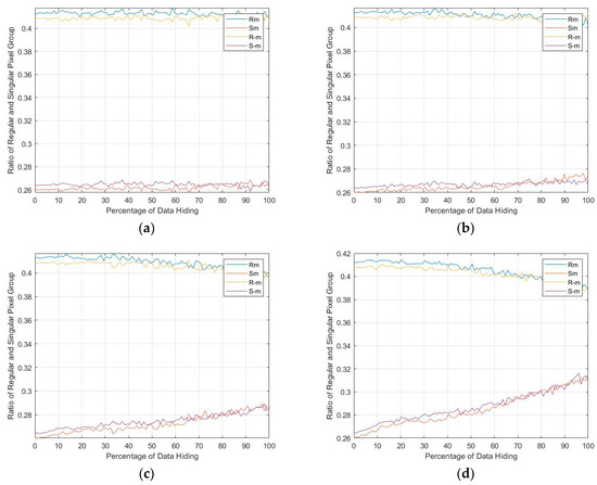 Finally, a statistical steganalysis method called RS analysis, which measures the ratio of Regular (R) and Singular (S) pixel groups, was used to measure the security of the algorithm. In this analysis, the ratio of regular pixel groups (Rm, R-m) to less than the ratio of the singular pixel group (Sm, S-m) indicates that there is distortion in the image, that is, secret data may be embedded. In other words, that image is normal when the expression “Sm ≈ S-m < Rm ≈ R-m” is provided. When the difference between (Rm, R-m) values and (Sm, S-m) values increase, it is understood that there is secret data in the image. Figure 12 presents RS analysis results for the proposed method. The proposed method proves to be resistant to steganalysis attacks, even when there is high capacity of secret data in the stego image, when examining Figure 12a–d.