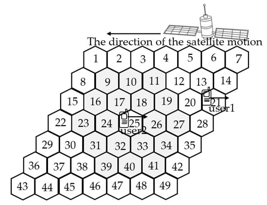 The mobility model of the users is shown in Figure 1. The LEO satellite used the SFC coverage mode. The user mobility was simplified to a linear motion. Compared with the satellite movement speed, the speed of the terminal users had the same value and the opposite direction [38].