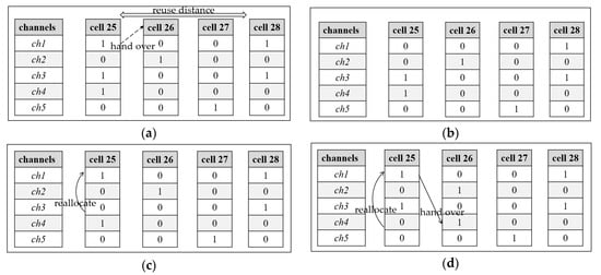 If the policy could ensure an eligible channel for the handoff call of its adjacent cell, the rejection probability of the handoff call was effectively reduced. We assumed that there were 5 channels (ch1–ch5) in the LEO satellite network and the minimal reuse distance was 3. The served calls and the channel status are shown in Figure 2a. When the call on channel 1 of cell 25 handed over, the following three options were available for handling the handoff call event: (1) As shown in Figure 2b, without a reallocation, the call on channel 1 of cell 25 departed. The status of channel 1 of cell 25 was transformed from 1 to 0 and then the channel was released. According to the relative definitions and the channel status in I(26), Ã(26) was none. Thus, adjacent cell 26 had no eligible channel. As a result, the handoff call was rejected. (2) As shown in Figure 2c, channel 1 (occupied by the departure call) was reallocated to the call on channel 3 and then channel 3 was released. According to the current channel status in I(26), Ã(26) was none. Thus, adjacent cell 26 still had no eligible channel. As a result, the handoff call was rejected. (3) As shown in Figure 2d, channel 1 (occupied by the departure call) was reallocated to the call on channel 4 and then channel 4 was released. According to the current channel status in I(26), Ã(26) = {ch4}. Thus, adjacent cell 26 had an eligible channel ch4. As a result, the handoff call was successfully accepted. If the policy selected option 3, as shown in Figure 2d, the policy ensured an eligible channel for the handoff call and reduced the rejection possibility of the handoff call.