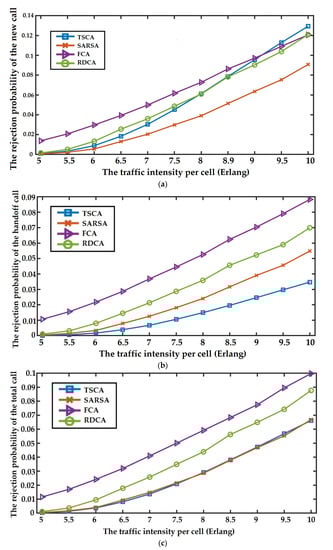 Figure 3 shows the comparison results of the four channel allocation algorithms under a uniform traffic distribution with different traffic intensities. It can be seen from Figure 3 that the performances of the different channel allocation algorithms decreased with an increase in the traffic intensity. In terms of the total performance, the RDCA was better than the FCA because the RDCA dynamically allocated eligible channels. The TSCA and SARSA were better than the RDCA. The reason was that RL can learn how to select and perform the actions from a continuous interaction with the environment; thus, the TSCA and SARSA could allocate more appropriate channels to the calls. The rejection probability of a new call with the TSCA was higher than SARSA. That was because the TSCA allocated more eligible channels to the handoff calls and the remaining eligible channels for the new calls were reduced. The rejection probability of a handoff call with the TSCA was much lower than that of the other algorithms. That was because the TSCA made full use of the temporal–spatial correlation of the handoff calls and allocated the eligible channels to the handoff calls. The rejection probabilities of a total call of the TSCA and SARSA were almost the same because they all performed optimal actions in real-time to allocate appropriate channels.