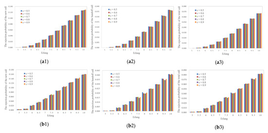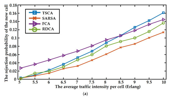 The performance of the same algorithm under different traffic distributions can be seen in Figure 3 and Figure 5. It can be seen from Figure 3a and Figure 5a that the advantage of a dynamic channel allocation was clearly reflected under a nonuniform traffic distribution. For instance, the rejection probability of a new call of the FCA was 2.4% higher than that of a uniform traffic distribution and the RDCA was 1.5% higher than that of a uniform traffic distribution at 10 Erlangs. In other words, the rejection probability of a new call of the FCA under a nonuniform traffic distribution was 19.98% higher than that under a uniform traffic distribution at 10 Erlangs and the rejection probability of a new call of the RDCA under a nonuniform traffic distribution was 12.74% higher. It can be seen from Figure 3b and Figure 5b that the rejection probability of a handoff call of SARSA under a nonuniform traffic distribution was 18.17% higher than that under a uniform traffic distribution at 10 Erlangs and the rejection probability of a handoff call of the TSCA under a nonuniform traffic distribution was 11.04% higher. The TSCA not only had the lowest rejection probability of a handoff call, but also played a significant role in the performance, especially under a nonuniform traffic distribution and a high traffic intensity. As the TSCA considered the temporal–spatial correlation of the handoff calls, it dynamically allocated more appropriate channels for the handoff calls than SARSA.