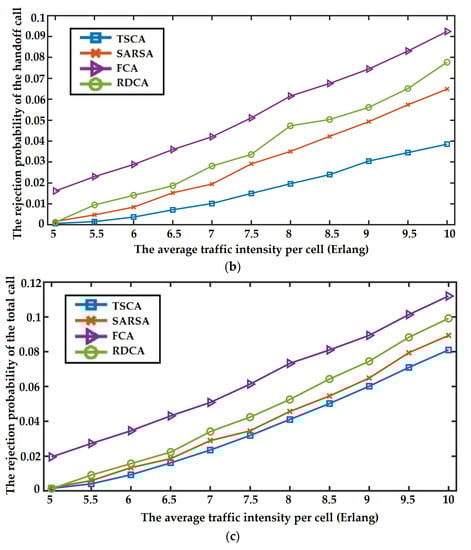 The performance of the different a”gori’hms under the same traffic distribution can be seen in Figure 3 and Figure 5. It can be seen from Figure 3b and Figure 5b that the rejection probability of a handoff call of the TSCA was 40.59% lower than that of SARSA under a nonuniform traffic distribution at 10 Erlangs. In the case of a uniform traffic distribution, the rejection probability of a handoff call of the TSCA was 36.68% lower than that of SARSA at 10 Erlangs. It can be seen from Figure 3c and Figure 5c that the rejection probability of a total call of the TSCA was 9.3% lower than that of SARSA at 10 Erlangs under a nonuniform traffic distribution. In the case of a uniform traffic distribution, the rejection probability of a total call of the TSCA was 0.8% lower than that of SARSA at 10 Erlangs. The TSCA improved the performance of the handoff calls, especially under a nonuniform traffic distribution and a high traffic intensity. The TSCA was better than SARSA, especially under a nonuniform traffic distribution.
