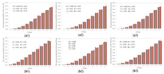 Performance comparison of TSCA with different values of gamma. (a1) The rejection probability of the new call under uniform distribution; (a2) the rejection probability of the handoff call under uniform distribution; (a3) the rejection probability of the total call under uniform distribution; (b1) the rejection probability of the new call under nonuniform distribution; (b2) the rejection probability of the handoff call under nonuniform distribution; (b3) the rejection probability of the total call under nonuniform distribution.