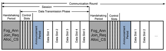 Each session in a communication round starts with a handshaking period. During the handshaking period, the broadcasts the announcement message () to all vehicles in its communication range. All vehicles must keep their radios ON to receive the announcement message. Vehicular nodes select the , whose announcement message is heard with the largest signal strength. In the case of a tie, the next is selected. After that, vehicles reply with a join request () message. This message consists of the control message, vehicle’s address, address and frame check sequence. After that, waits for some time to receive all the and then calculates the total number of vehicle requests. computes a unique 1-byte short address for all the associated member nodes and for itself. Therefore, a maximum of 255 member nodes can be associated with a single .