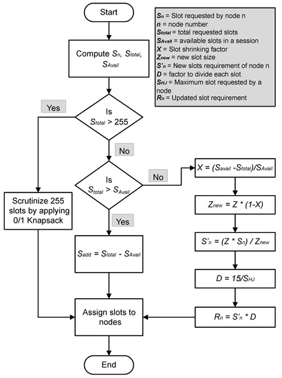 In case the number of requesting slots by patients’ vehicles is more than the maximum allowed limit of the proposed protocol, then the TDMA session cannot accommodate all data-requesting patients’ vehicles. In this case, the data-requesting vehicles are optimally assigned data slots by applying the knapsack optimization algorithm. A complete flow chart of the proposed scheme is shown in Figure 4.