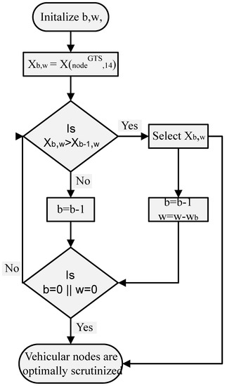 The knapsack algorithm starts with creating the knapsack table that has rows and columns, where N is the total number of vehicles and is the maximum number of slots, i.e., 255. After the creation of the table, the knapsack algorithm starts filling the table. A complete algorithm for filling the 0/1 knapsack table in is shown in Figure 5. After creating and filling the knapsack table, the most sensitive data-requesting vehicles that have accumulative slots equal to or less than is selected. Successful data-requesting vehicular node selection is shown in Figure 6.
