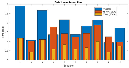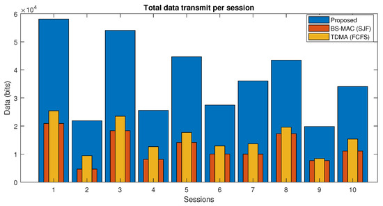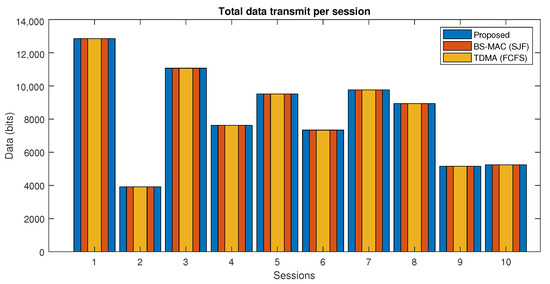 In Figure 8, the total amount of data transmitted in each session of the proposed protocol and BS-MAC is compared. There is a total of 10 sessions simulated with different numbers of nodes per session. Both BS-MAC and the proposed protocol allow all the nodes in each session to transmit all the data because all the nodes have less data than the session capacity.