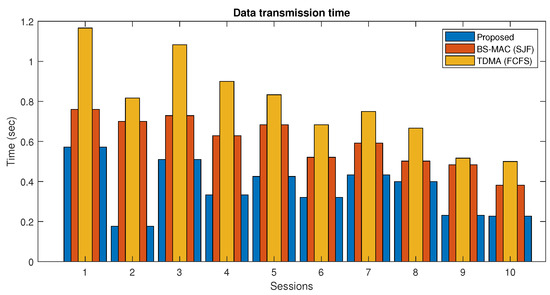 In Figure 10, the data transmission time of both proposed and BS-MAC protocols is compared in the case when the slots requests are less than the available slots. There are a total of 10 sessions simulated with a different number of nodes per session. Results show that the data transmission time for each session in the proposed protocol is far less than the BS-MAC protocol, because in this case, data are less than the total session capacity, and the proposed protocol reduced the session by shrinking the slot size by following data slots requests.