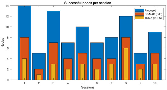 In Figure 7, successful nodes per session of the proposed protocol and BS-MAC are compared. A successful node refers to the node which can transmit all the data successfully to the cluster head within a session. There is a total of 10 sessions simulated with a different number of nodes per session. All the nodes in each session succeeded in both protocols because the total slots requests are less than the available slots.