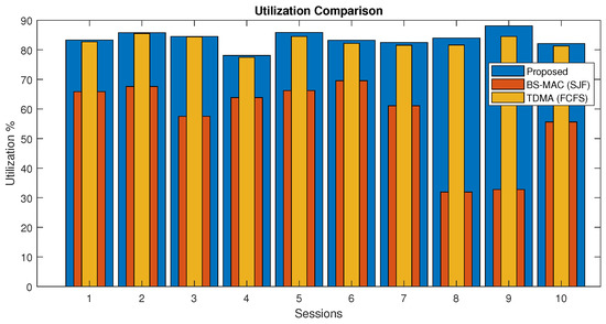 In Figure 9, the channel utilization of proposed and BS-MAC protocols are compared for a session. There is a total of 10 sessions simulated with a different number of nodes per session. Results show that channel utilization of the proposed protocol is far better than BS-MAC because in this case, data are less than the total session capacity, and the proposed protocol reduced the session by shrinking the slot size by following data slots requests. The proposed protocol is more adaptable than BS-MAC because it divides the shrink slots by different numbers in every session according to slot requests. Whereas, in BS-MAC, data slots are divided by 10 in every session.