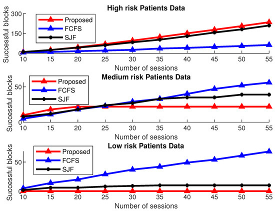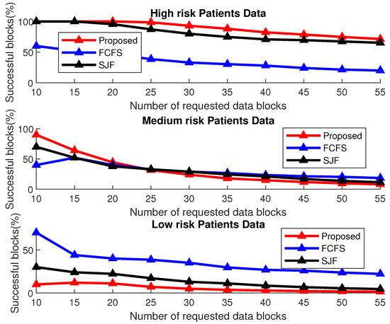 The results shown in Figure 16 elaborate the same results in terms of percentage with a varying number of the patients’ data blocks in each session. It is evident from the results that the proposed scheme accommodates the maximum of the high-risk patients’ data as compared to the other two schemes by compromising the medium-risk and low-risk patients’ data as compared to the other two schemes for fixed session length.