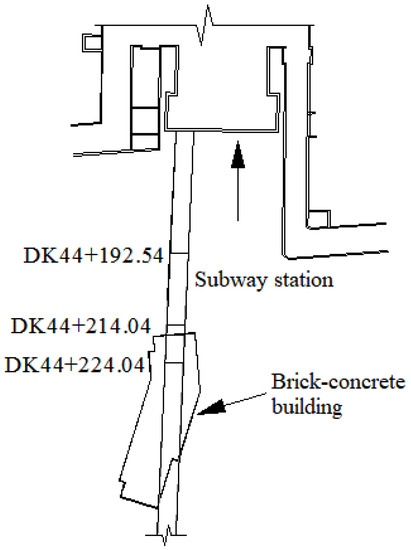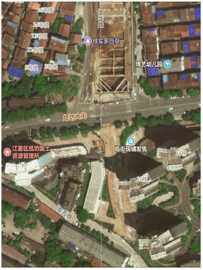 For the section from Zhifang Street Station to Metro Town Station of Wuhan Rail Transit Line 27, the subway tunnel is constructed by mining method, and the starting mileage of the section is DK44+155.54. The tunnel goes through a three-story kindergarten, which is a brick concrete structure building. The satellite map around the kindergarten is shown in Figure 1. The tunnel is designed to be 7.962 m high and 7.074 m wide. The surface environment is complex. The tunnel passes through a three-story brick concrete building. The plan is shown in Figure 2. The height from the building structure floor to the tunnel roof is 25 m.