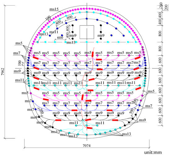 The tunnel blasting construction adopts straight hole cutting, and the cutting hole is arranged at the lower center of the upper step, which is composed of two rounds of charging holes and empty holes in the inner ring and outer ring. The five empty holes are arranged in the center of the cutting area to increase the free surface. The depth of the cutting hole is 1.5 m, the center spacing of the empty hole is 400 mm, and the row spacing is 200 mm. The spacing of the inner ring cutting holes is 200 mm, and the spacing of the outer ring cutting holes is 400 mm. The specific cut-hole layout, detonator delay time, and network are shown in Figure 3.