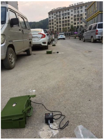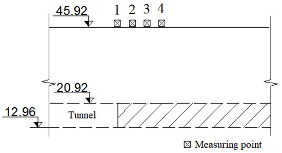 Four NUBOX–6016 monitors are used to monitor the blasting vibration. The subway tunnel goes through a three-story kindergarten, which is a brick concrete structure building. The monitoring instruments are arranged along the footage direction to monitor the propagation law of blasting seismic wave in brick concrete structure buildings. The first of the four instruments is arranged right above the working face, the second measuring point is arranged 5 m ahead of the working face, the third measuring point is arranged 10 m ahead of the working face, and the fourth measuring point is arranged 15 m ahead of the working face. The vibration speed and frequency of the tunnel that is going through below are monitored, and the distance between the tunnel top and the ground surface is about 25 m. Figure 5 shows the layout of measuring points, and the layout of on-site measuring points is shown in Figure 6.