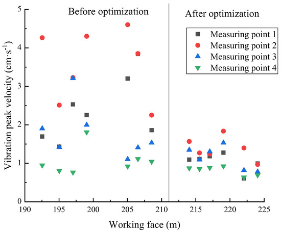 According to the stipulations in the blasting safety regulations GB6722–2014 [37], due to the low vibration frequency of brick concrete structure buildings, the allowable safe vibration velocity is 1.5–2.0 cm/s. Before the optimization of the blasting scheme, the measured peak vibration velocity is in the range of 0.764–4.603 cm/s. After the blasting scheme is optimized, the measured vibration peak velocity is within the range of 0.607–1.835 cm/s, which is less than 2.0 cm/s. The vibration peak velocity after the blasting scheme is optimized meets the safety requirements specified in the blasting safety regulations.