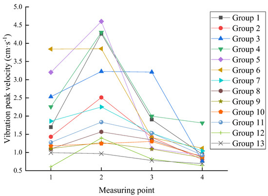 According to the data in Table 2, the relationship between the vibration peak speed and the location of the measuring point is drawn, as shown in Figure 9. Digital Group1-13 in the figure represents 13 field tests.