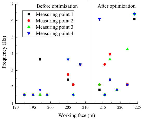 Before the optimization of the blasting scheme, during the blasting construction, the working face mileage is located at DK44+192.54.200–DK44+214.04, and the maximum single section charge is 7–10 kg. During the blasting construction, 7 sets of data were monitored, 28 blasting vibration signals were measured, and the blasting vibration frequency measured at the measuring point was within the range of 1.53–3.66 Hz. After the optimization of the blasting scheme, during the blasting construction, the working face mileage is located at DK44+214.04–DK44+224.04, and the maximum single section charge is 2.4–3.2 kg. During the blasting construction, six times of monitoring were conducted and six groups of measured data were obtained, with a total of 24 blasting vibration signals. The measuring points were arranged in the brick concrete structure building, and the measured blasting vibration frequency was 1.53–6.41 Hz, mainly concentrated in 1.53–5.00 Hz. By comparing the monitored blasting vibration frequencies before and after the optimization of the blasting scheme in Table 2 and the distribution of blasting vibration before and after the optimization of the blasting scheme in Figure 8, the optimization of the blasting scheme can be obtained, which significantly increases the blasting vibration frequency. The reference [37] stipulates that the allowable safety standards for blasting vibration in China consider both blasting vibration frequency and blasting vibration speed. For the same object, when the blasting vibration frequency is low, the safety allowable vibration speed is small. Since the natural vibration frequency of the brick concrete structure building is low, the blasting vibration frequency of the brick concrete structure building after the blasting scheme optimization becomes larger, which makes it more difficult to form resonance phenomenon, and the building is safer.