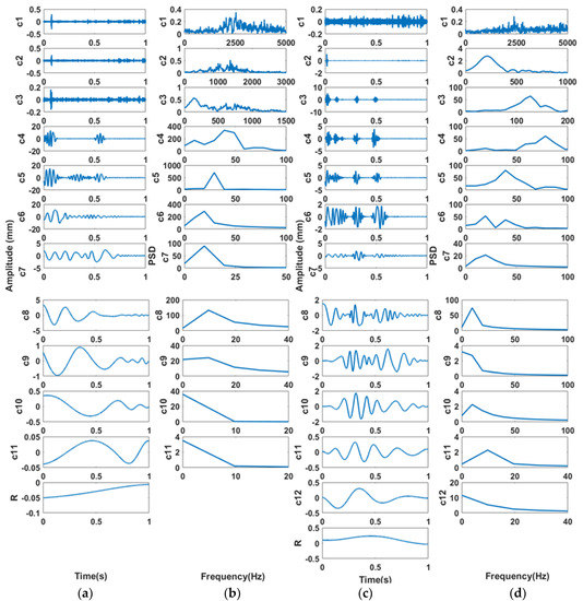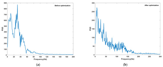 The low-frequency range is also the place where the signal energy is most concentrated after optimization, which is below 300 Hz. The energy is evenly distributed in the range of 150–250 Hz frequency band. When the energy is obviously increased in the range of the 0–150 Hz frequency band, and the energy is at maximum in the range of the 0–20 Hz frequency band, a maximum value appears. Compared with the PSD diagram shown in Figure 11d, the dominant range of the frequency corresponding to c1 is 100–150 Hz, and the amplitude is also the largest. The dominant range of frequencies corresponding to components c2, c3, c4, and c5 is 50–100 Hz, 20–50 Hz, 0–50 Hz, and 0–50 Hz, they also have relatively large amplitudes.