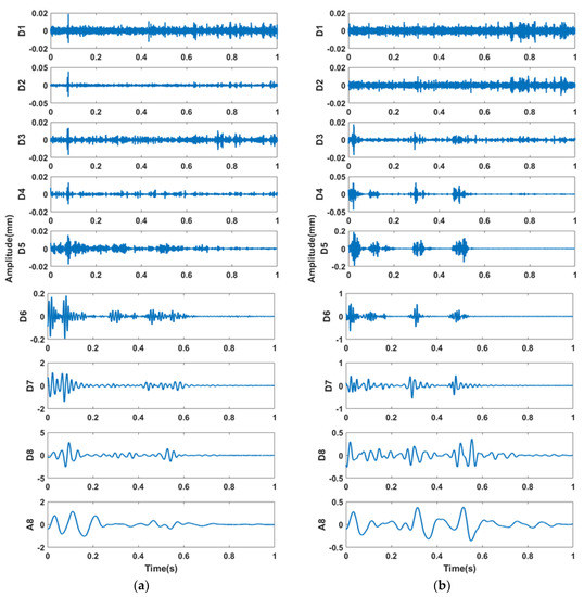 The wavelet transform needs to select the wavelet base first, and then transform. The signal reconstruction and error of the original signal based on the db3, db5, db8, and coif3 wavelet bases are very close to the original signal after reconstruction based on the four wavelet bases, but the reconstruction error of the original signal based on the db8 wavelet base is the smallest, about 2 × 10−11 mm, so db8 is selected as the wavelet basis for wavelet decomposition of the original signal.