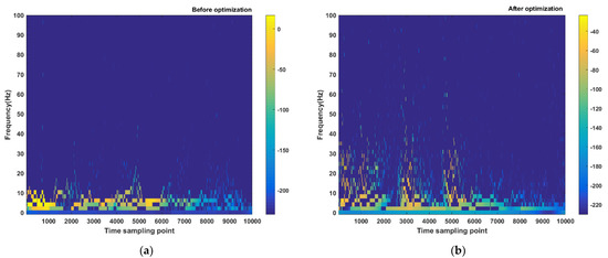 The Hilbert energy spectrum of blasting vibration signal (a) before optimization and after (b) optimization.