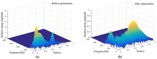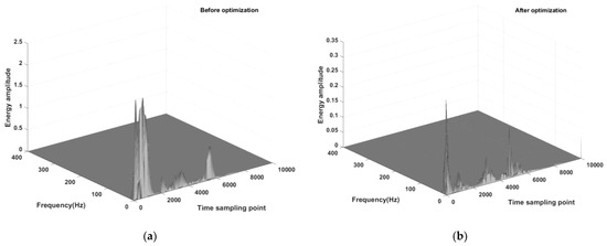 The Hilbert’s three-dimensional energy spectrum of blasting vibration signal (a) before optimization and (b) after optimization.