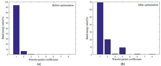 Band energy distribution diagram of blasting vibration signal (a) before optimization and (b) after optimization.