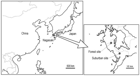 Location of the sampling sites. Suburban site: 32°47′07.9″ N, 129°51′52.6″ E; Forest site: 32°54′32.4″ N, 129°44′33.5″ E.
